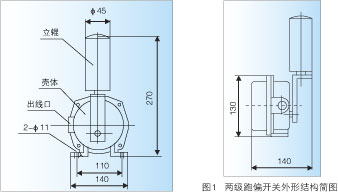 3、机内采用进口行程开关,触点容量大、动作灵敏、可靠、外形尺寸见图1