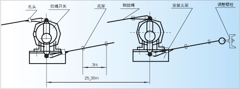 2、 两机之间距离为25-30m,采用直径为Φ4的钢丝绳连接,松紧应适度。