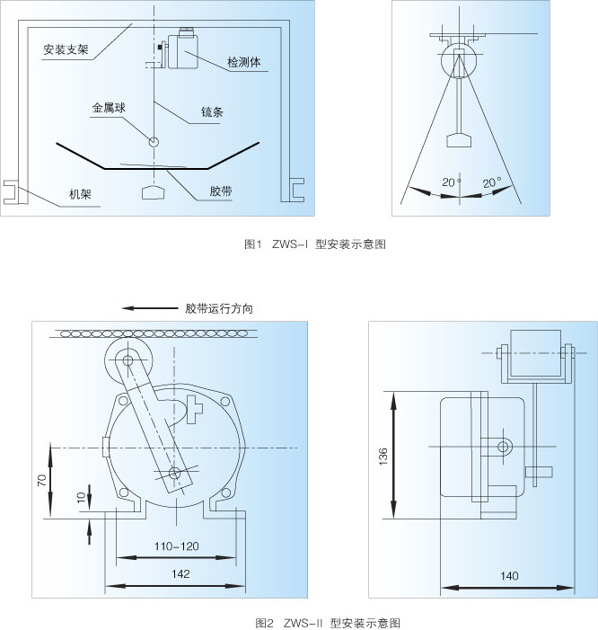 ZWS-Ⅰ型料流检测装置采用下垂挡板与物料接触方式。当胶带运送物料时,物料推动挡板并带摆臂向一侧偏移,若偏移角度大于20°时,内部开关启动,输出一组开关信号。
