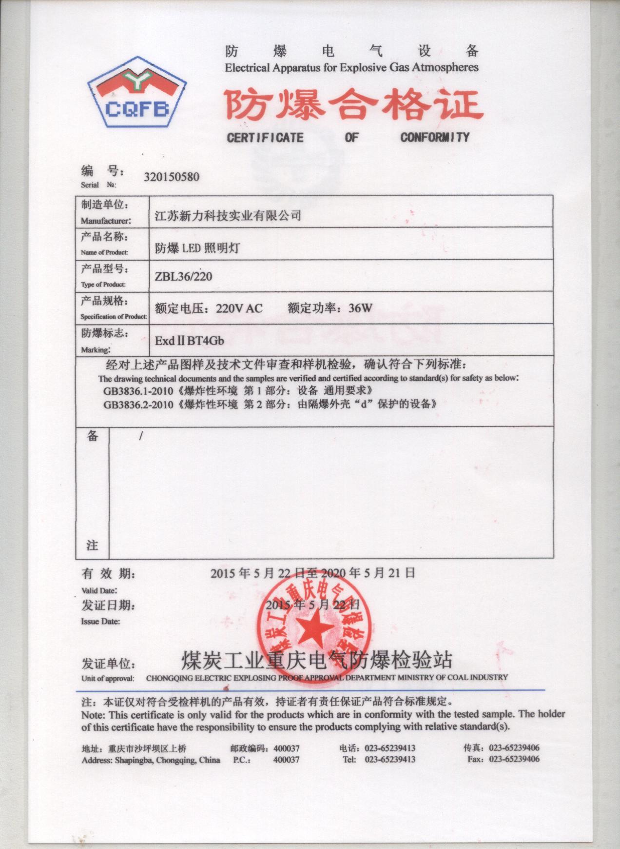 4.1本企业申请的产品严格按照GB3836.1-2010《爆炸性环境第1部分:设备 通用要求》、GB3836.2-2010《爆炸性环境第2部分:由隔爆外壳“d”保护的设备》、GB12476.1-2013《可燃性粉尘环境用电气设备 第1部分:通用要求》、GB12476.5-2013《可燃性粉尘环境用电气设备 第5部分:外壳保护型“tD”》生产,并应经国家级检测检验机构型式检验合格,取得防爆合格证(含粉尘和隔爆)。